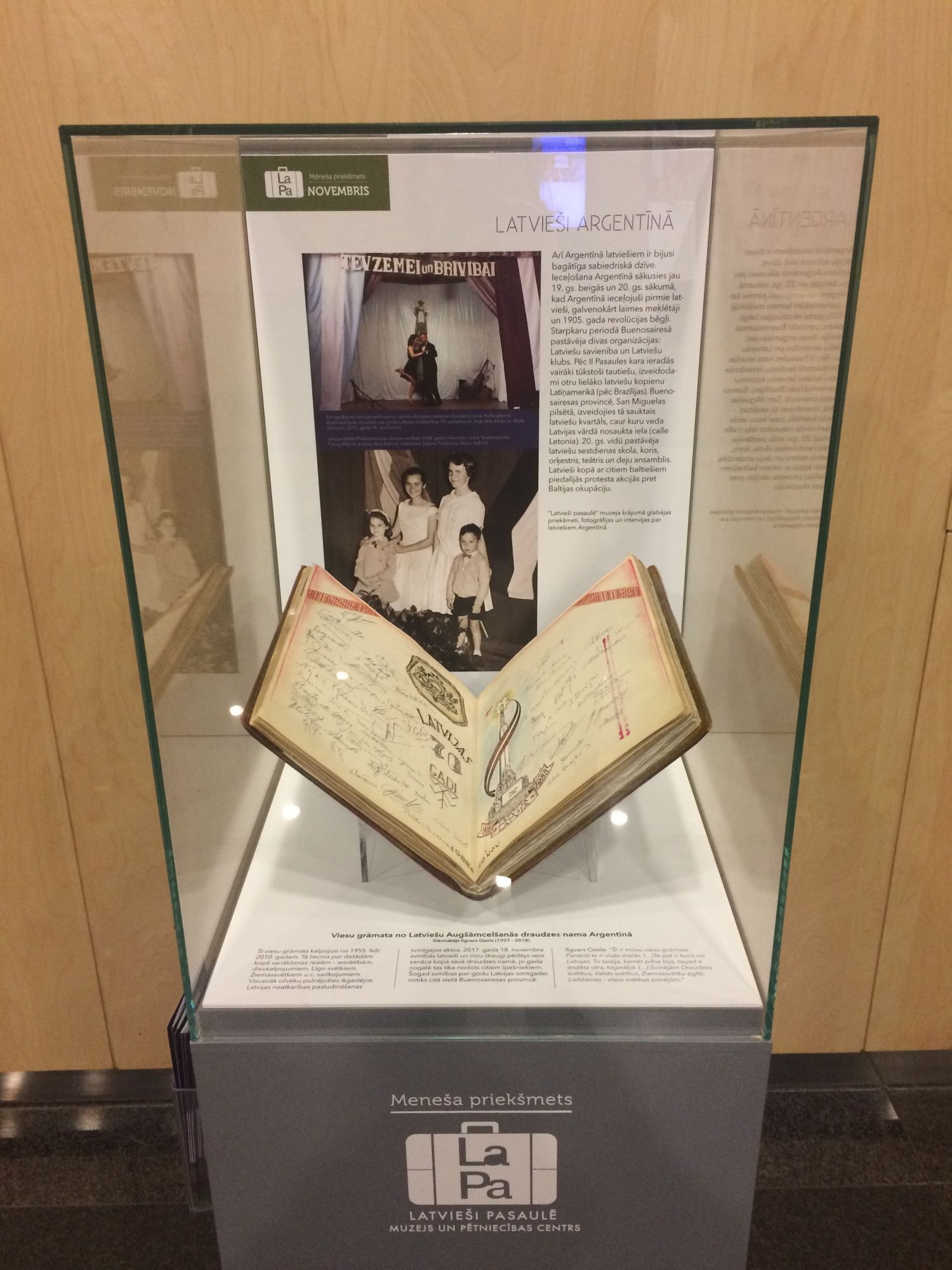 Viesu grāmata no Latviešu Augšāmcelšanās draudzes nama Argentīnā. Dāvinātājs Ilgvars Ozols (1927 – 2018). “Mēneša priekšmets”, novembris 2018, izstādīts Latvijas Nacionālās bibliotēkas 1. stāva vestibilā.