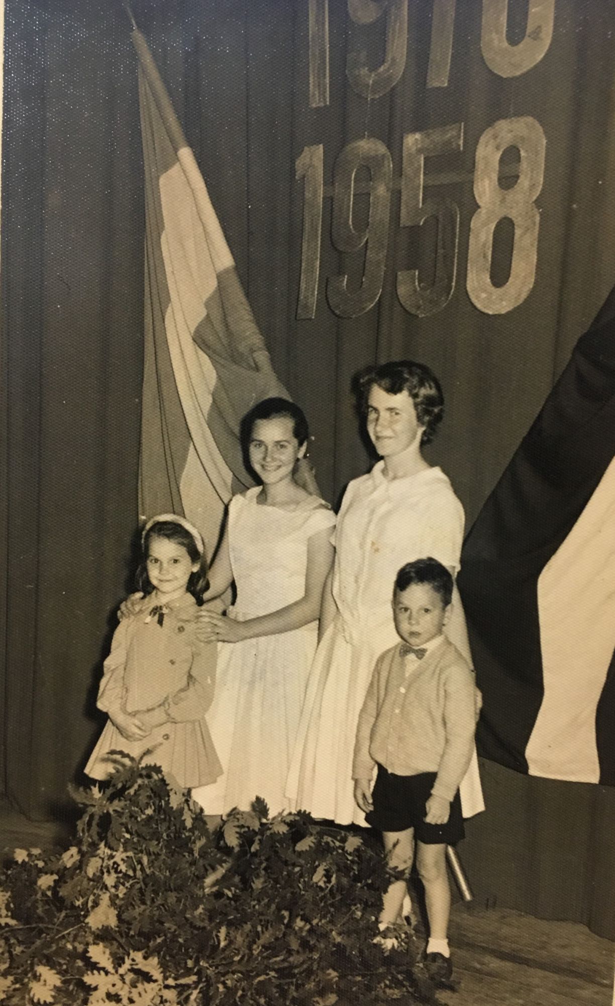 Latvijas Valsts Proklamēšanas dienas svinības 1958. gadā Lietuviešu namā, Buenosairesā. Fotogrāfijā no kreisās: Rita Kalniņš, nezināma, Sabina Trofimova, Mario Kalniņš.