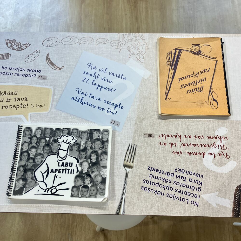Daļu grāmatu izstādes apmeklētāji var šķirstīt un pētīt, iepazīstot ne tikai receptes, bet arī latviešu dzīves apstākļus un ikdienu mītnes zemēs. Kādi pārtikas produkti ir pieejami? Kurus ēdienus ēd svētkos? Cik daudz laika saimnieces velta ēdienu gatavošanai? Kādi rīki izmantoti? Kā aizstāj trūkstošas sastāvdaļas? Atbildes meklēt palīdz izstādes autoru sagatavoti uzvedinoši jautājumi.