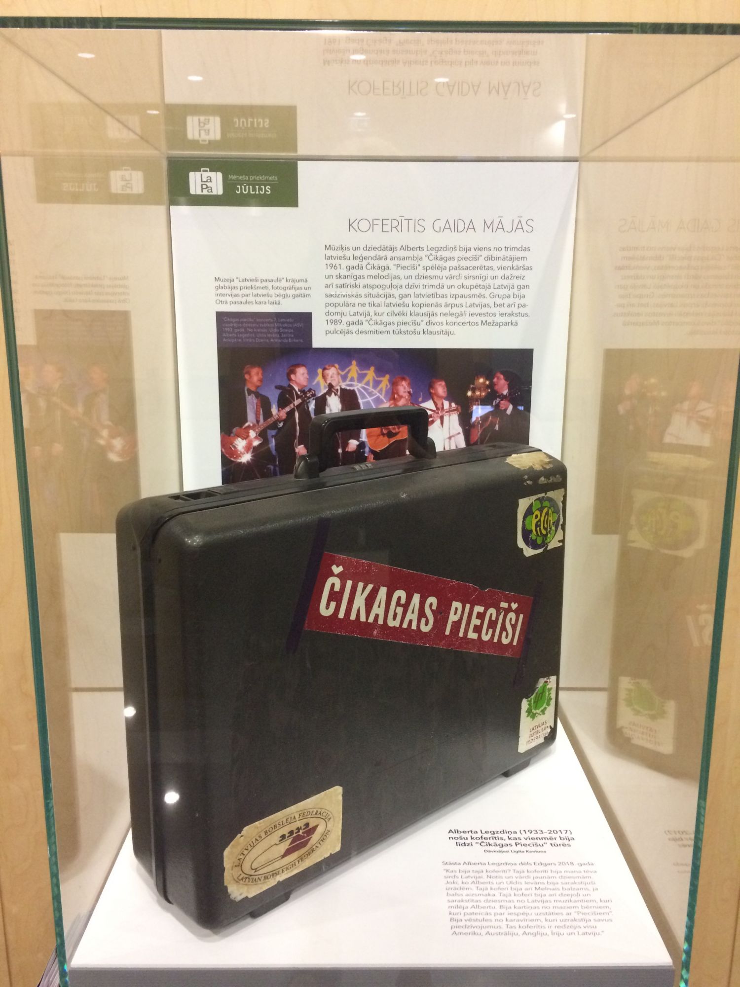 Alberta Legzdiņa (1933–2017) nošu koferītis, kas vienmēr bija līdzi “Čikāgas Piecīšu” tūrēs. Dāvinājusi Ligita Kovtuna. “Mēneša priekšmets”, jūlijs 2018. Izstādīts Latvijas Nacionālās bibliotēkas 1. stāva vestibilā.
