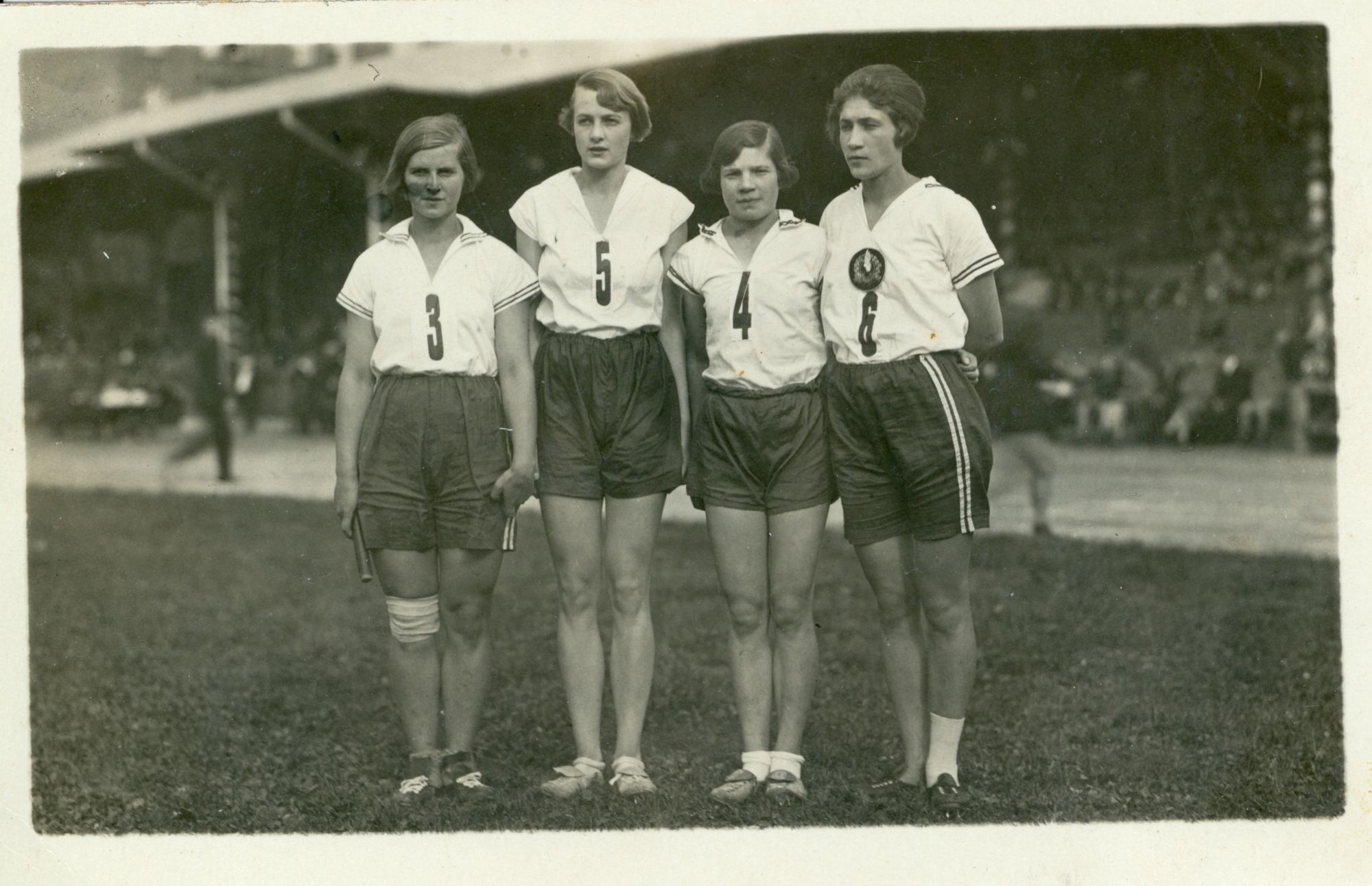 Latvijas vieglatlētes Liepājā, 20. gs. 20.tie gadi. No kreisās: E.Karlsone, Z.Liepiņa, E.Krūmiņa, J.Hmizovska. No Latvijas Sporta Muzeja krājuma.