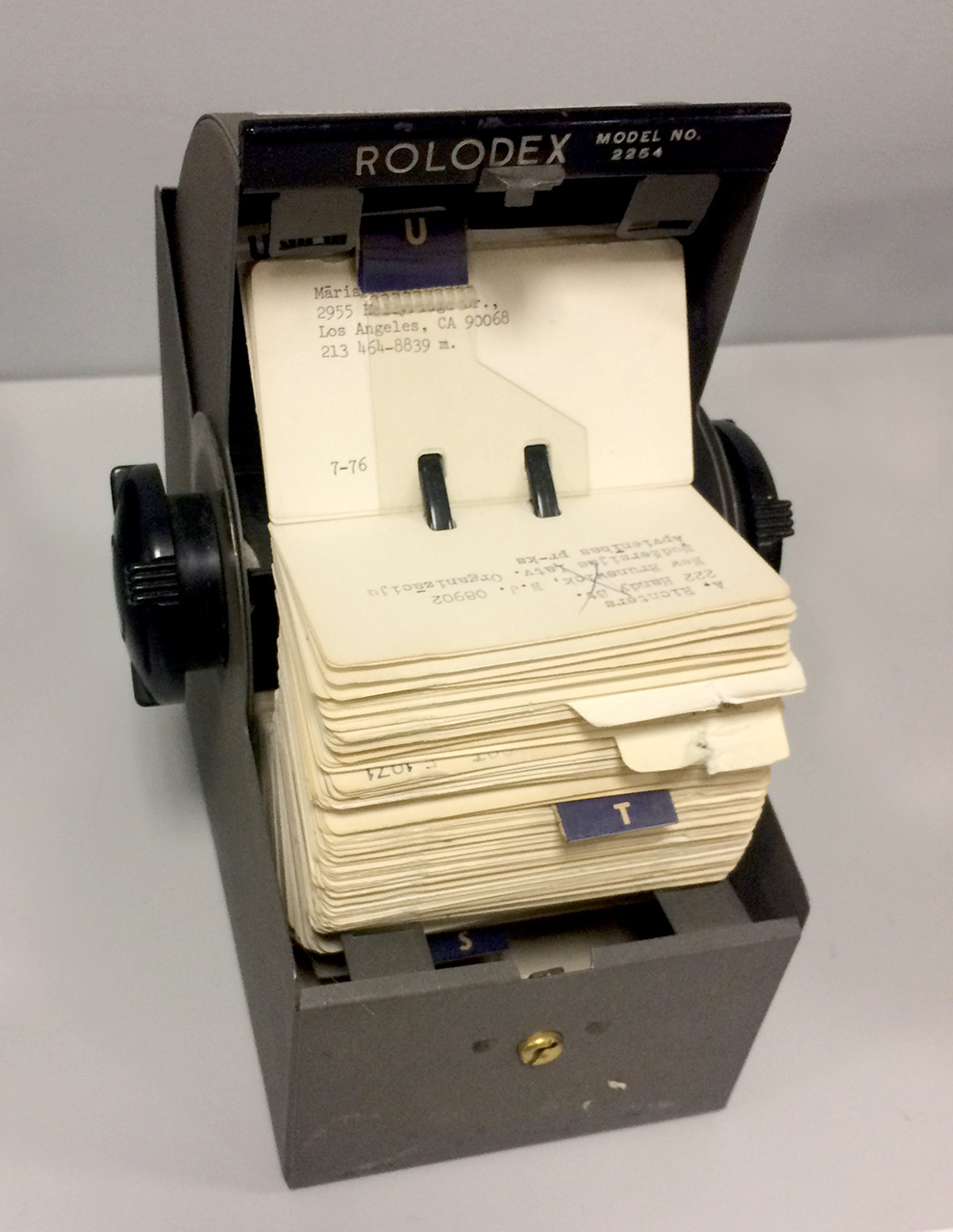 Kontaktu saraksts ‘rolodex’ sistēmā, ko lietoja Anita Tērauda un Ojārs Kalniņš Amerikas Latviešu Apvienības birojā Vašingtonā (ASV) Latvijas trešās atmodas laikā. “Mēneša priekšmets”, maijs 2018.